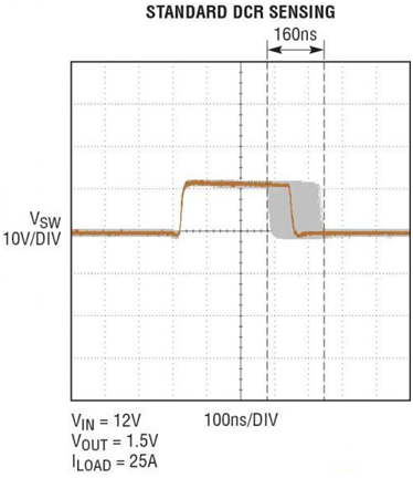 獨(dú)特的設(shè)計(jì)提高了效率以及噪聲靈敏度。在采用非常低的 0.32m? 電感器 DCR 時(shí),最差情況的開關(guān)節(jié)點(diǎn)抖動(dòng)減輕了 60%,如圖 5 所示。
